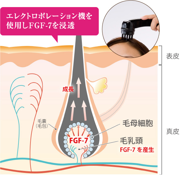 23種類あるfgfの一種で毛乳頭でつくられている「育毛促進因子」です。fgf-7が毛乳頭細胞から毛母細胞に成長命令を出すことで髪の毛が成長する効果があります。